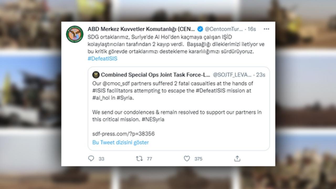 Mesajda, “SDG ortaklarımız, Suriye’de Al Hol’den kaçmaya çalışan DEAŞ kolaylaştırıcıları tarafından 2 kayıp verdi. Başsağlığı dileklerimizi iletiyor ve bu kritik görevde ortaklarımızı destekleme kararlılığımızı sürdürüyoruz” denildi.