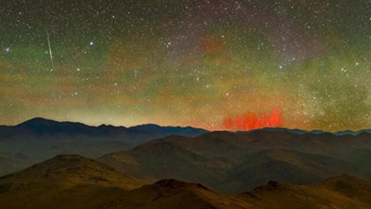 Kırmızı periler, ESO’nun La Silla’daki 3,6 metrelik teleskobunun platformunda bulunan kameranın perspektifinden dolayı ufukta alçakta görünüyor. Fotoğrafın arka planı, gök aydınlığı (gece aydınlığı) olarak bilinen yeşil bir renk tonu gösteriyor.