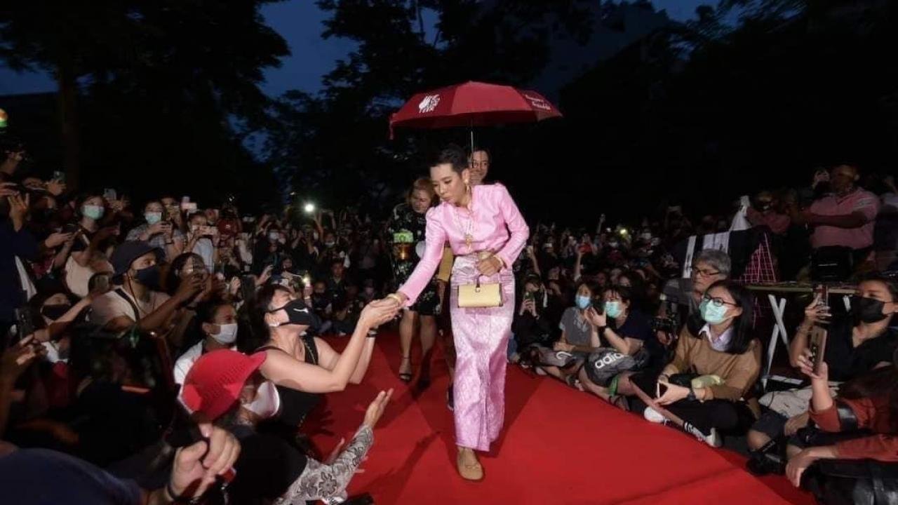 Jatuporn “New” Saeoueng, 29 Ekim 2020’de monarşi reformu talebiyle düzenlenen protestolarda bir sokak defilesi düzenlemiş ve kırmızı halıda geleneksel pembe kıyafetiyle yürürken bir arkadaşı da arkasından şemsiye tutmuştu.