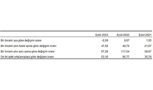 YD-ÜFE (2010=100) 2023 yılı Eylül ayında bir önceki aya göre %0,59 azalış, bir önceki yılın Aralık ayına göre %47,62 artış, bir önceki yılın aynı ayına göre %57,25 artış ve on iki aylık ortalamalara göre %53,10 artış gösterdi.