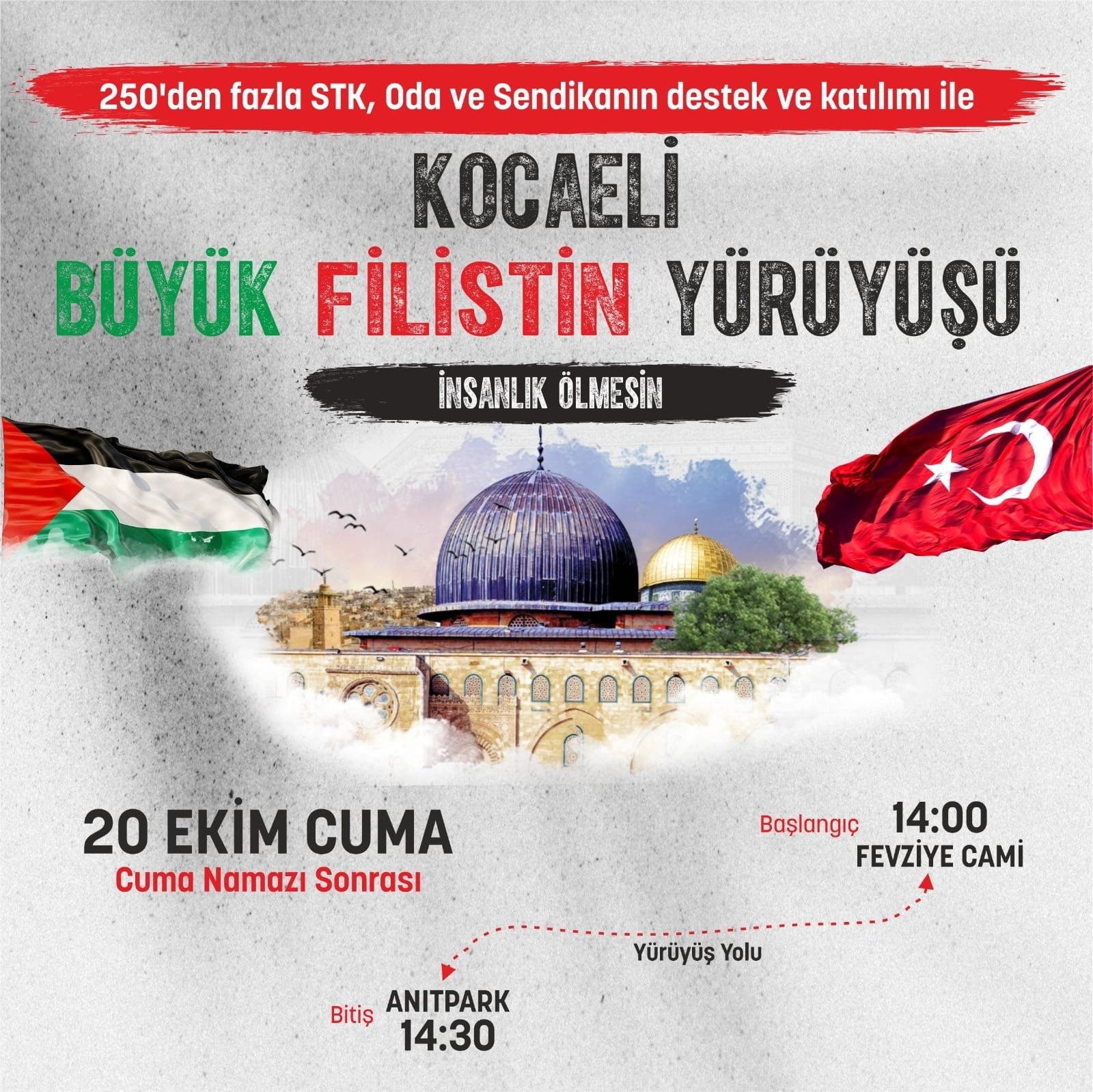 20 Ekim Cuma günü İzmit Fevziye caminde kılınacak Cuma ve gıyabi cenaze namazının ardından kortej Cumhuriyet bulvarında ilerleyecek. Yeni Cuma’dan ve diğer camilerden katılımlar gerçekleşecektir. Saat 14.30 Anıtpark’ta kadar yürüyüş ile İsrail’in Filistin halkına karşı yaptığı soykırım protestosu yapılacaktır.