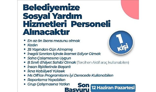 İnegöl Belediyesi, en az ön lisans mezunu olmak üzere 35 yaşını aşmamış, kadın sosyal yardım hizmetleri personeli alımı yapılacağını duyurdu. Son başvuru 12 Haziran 2023 olarak açıklandı.
