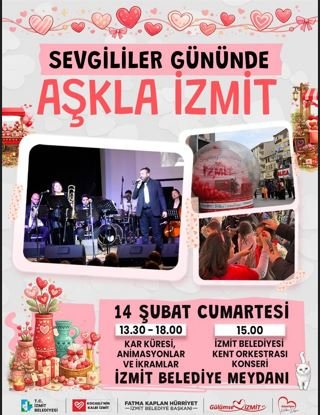 Sevgililer Günü programı kapsamında saat 15.00’te İzmit Belediyesi Kent Orkestrası konser verecek. Belediye Meydanı’nda gerçekleşecek konserle birlikte müzik dolu dakikalar yaşanacak.