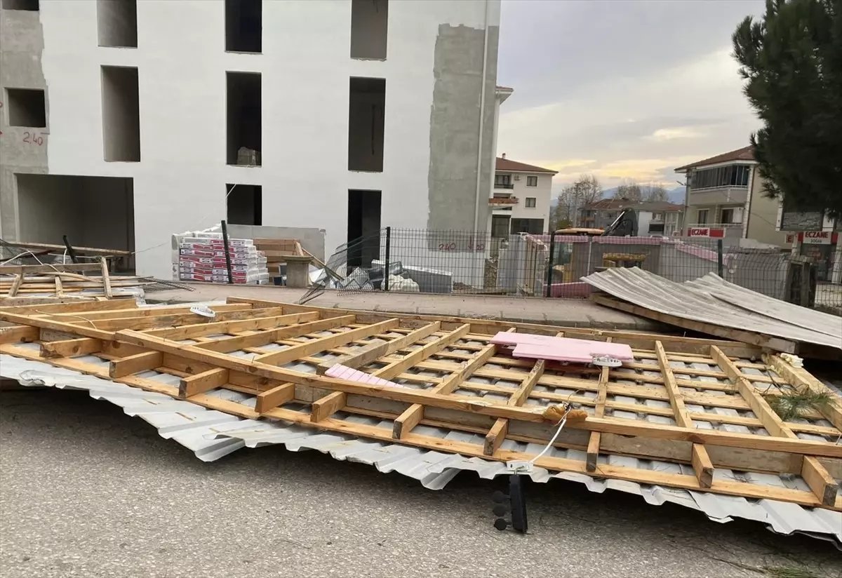 Fırtına nedeniyle Arifiye ilçesi Fatih Mahallesi’nde yapımı devam eden aile sağlığı merkezine ait şantiyenin çatısı yola uçtu.