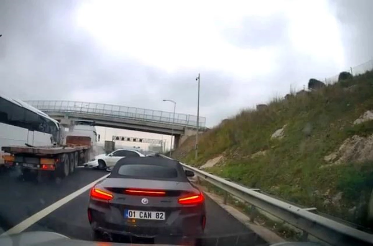 TEM Otoyolu’nun Kocaeli geçişinde yol ortasındaki plastik kasaya çarpmamak için manevra yapan otomobil, önce tıra sonra otomobile çarparak savruldu. O sırada arkadan gelen tır ise savrulan otomobile ve yolcu otobüsüne çarptı. O anlar saniye saniye kameraya yansıdı.