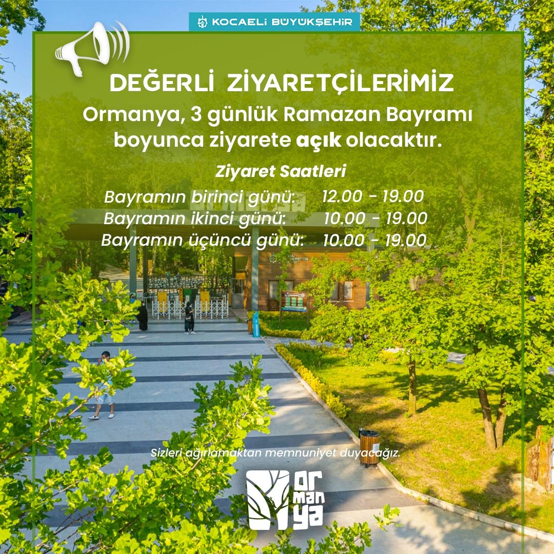 Bayram boyunca hizmet verecek olan Ormanya, doğayla baş başa olmak isteyen tüm doğaseverler için bayram sürecinde bayramın birinci günü 12.00-19.00, ikinci üçüncü ve günü ise 10.00-19.00 saatleri arasında açık olacak.